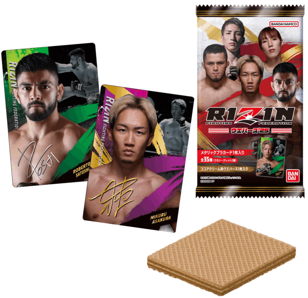 『RIZINウエハース’25』は、ココアクリーム味ウエハース1枚とメタリックプラカード1枚がセットになった商品です。